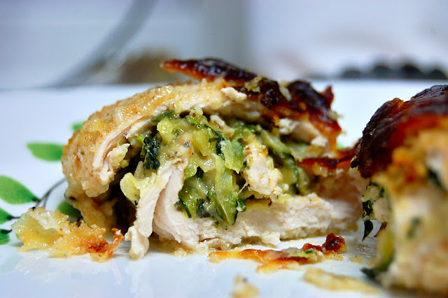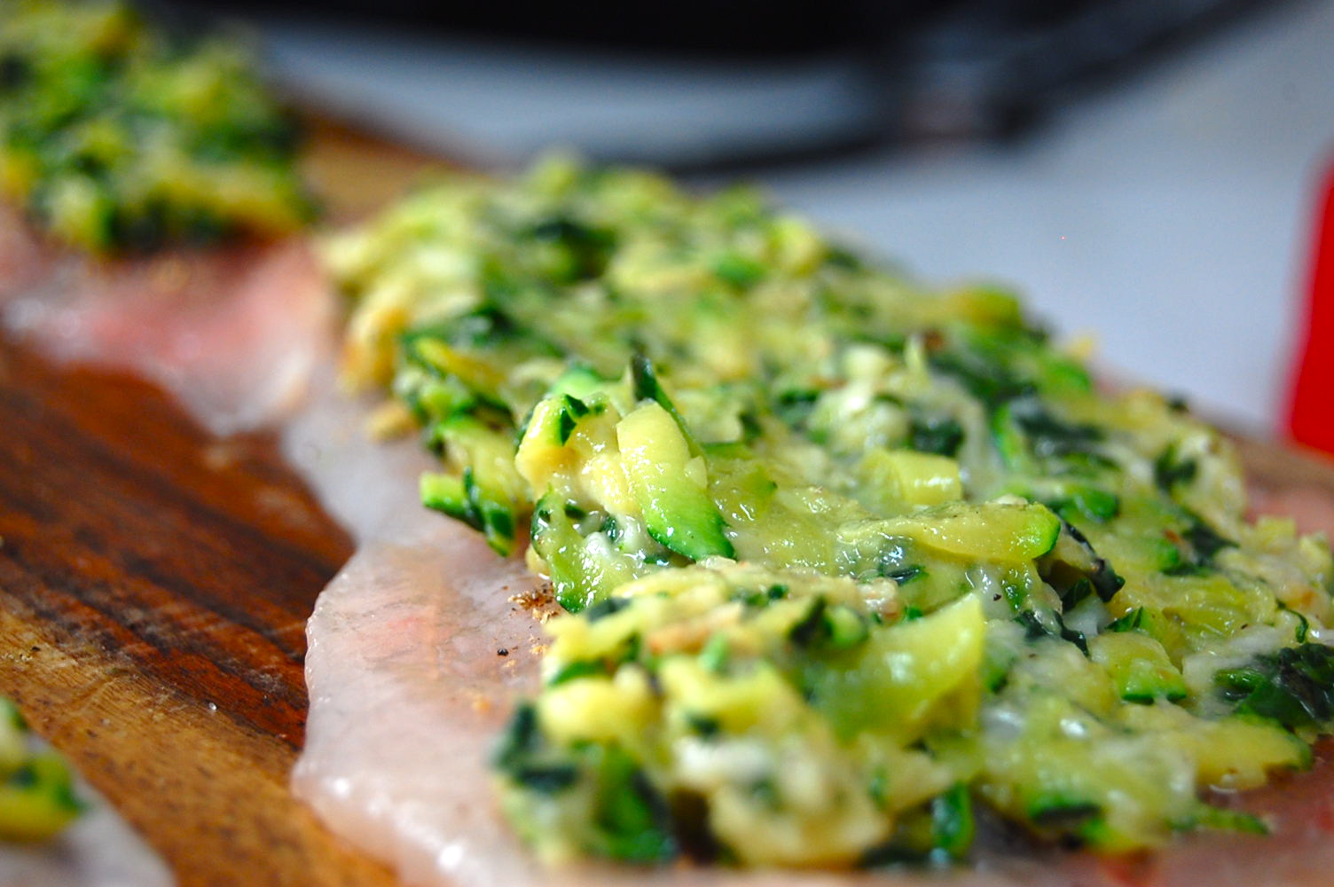 Lay chicken down on a working surface and spread 3 tbsp of zucchini-spinach-cheese mixture on each cutlet. Loosely roll each one and keep seam side down.