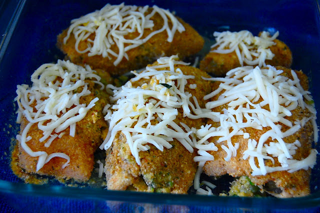 Dip chicken in lemon-oil mixture, then in breadcrumbs and place seam side down in a baking dish (no toothpicks needed). Repeat with the remaining chicken. When finished, lightly spraywith oil spray. Top with remaining mozzarella cheese- just remember to cover dish with foil to prevent cheese from burning!
