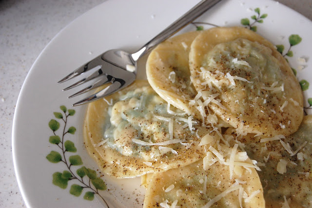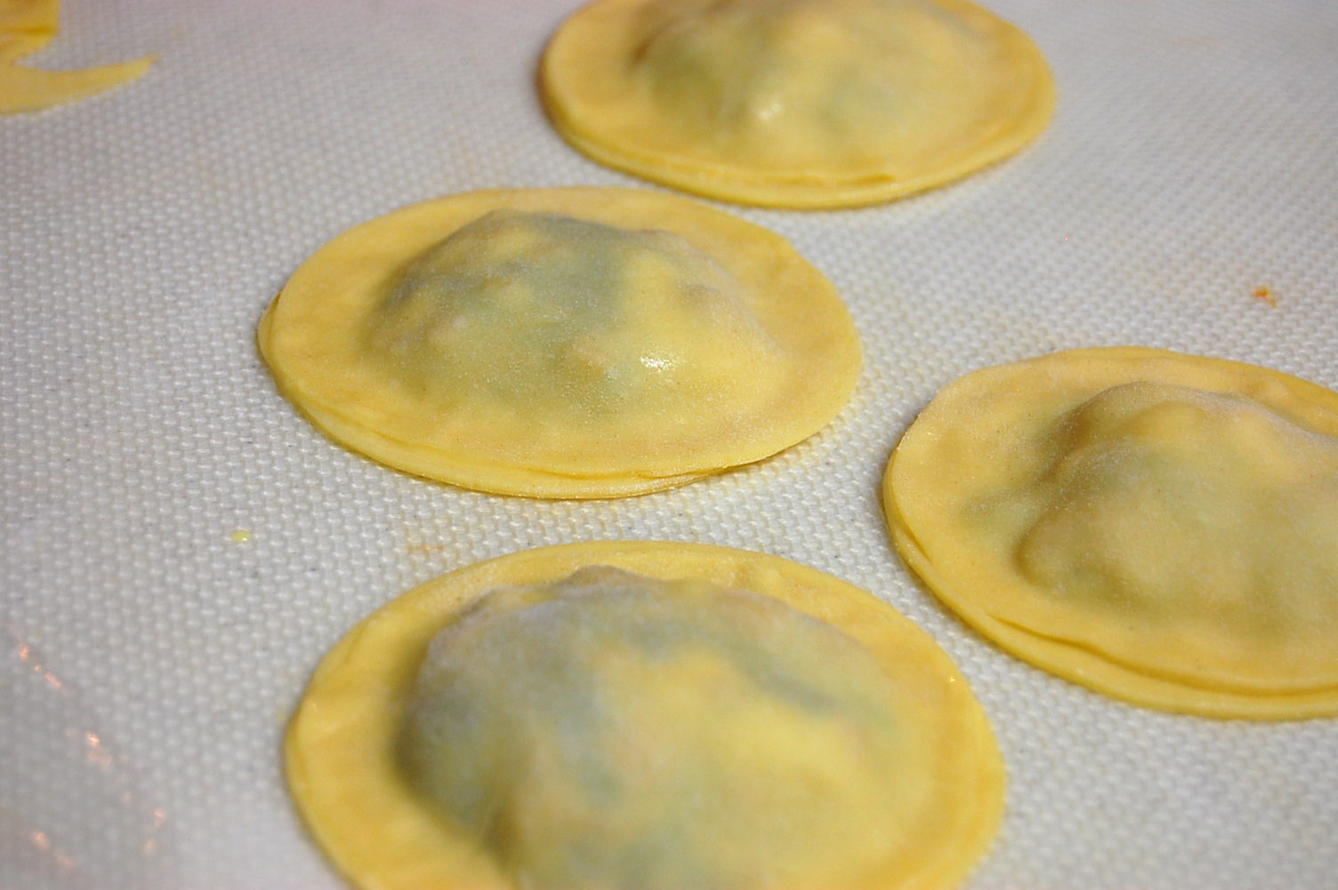 Did you know that ravioli is traditionally a vegetarian dish? From what I was reading, the word ravioli comes from an Italian verb meaning to stuff or wrap, and they originated in the Liguria region of Italy. Their diet was a lot of vegetables, fish and pasta, because they did not have a lot of room on which to raise meat rendering animals. Interesting, huh? (source: http://www.patriciathomson.net/PatriciaThomson/farinata.html)