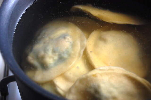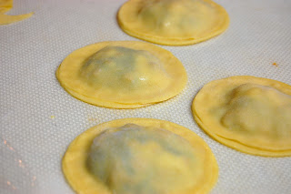 Once you have and even number of circles cut out from the first ball of dough, drop 1-2 tablespoons onto the center of half of the circles. You want about 1/4 inch free space at the edge of the circles all the way around. Dip your (clean) finger into the egg wash and trace the rim of the circle with the filling. Gently lay an unfilled circle on top, pressing gently from the center out to get rid of any air bubbles. End with pressing around the edges gently to seal the ravioli. Store on a lightly greased cookie sheet, using plastic wrap sprayed with Pam between layers so the pasta doesn't stick to each other.