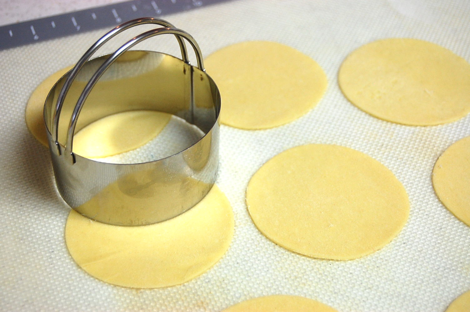 To make the ravioli, tear off a piece of dough about the size of a golf ball, and recover the remaining dough with plastic wrap so it does not dry out. Flatten the small ball with your hands, then roll out until it's very thin but not quite translucent. The shape does not really matter, since the next thing you'll need to do is use a biscuit cutter to cut out circles from the dough sheet.