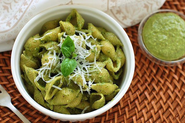 **If you are harvesting a large batch of homegrown basil, or just got a bunch on sale and want to freeze it, just make it without the cheese and pour into ice cube trays. Once it's frozen, pop them out of the trays and store in ziplock bags, adding the cheese once it's thawed and ready to serve.