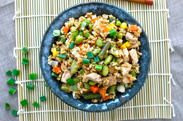 You may have noticed from the pictures that this version of fried rice does not include scrambled eggs. Yeah, about that.... I don't care for eggs in the fried rice, unless of course it's a breakfast version, in which case it makes much more sense. If you add them for protein, never fear, because the lean chicken breast and edamame that's in this version takes care of that concern.