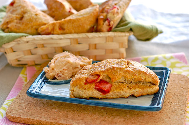 Heat oven to 375°F. Toss strawberries with 1/4 cup whole wheat flour, set aside. Mix dry ingredients and butter in a food processor, pulse until coarse crumbs form and start to climb the sides of the processor bowl. Transfer mixture to large bowl, add the wet ingredients and stir until just combined.