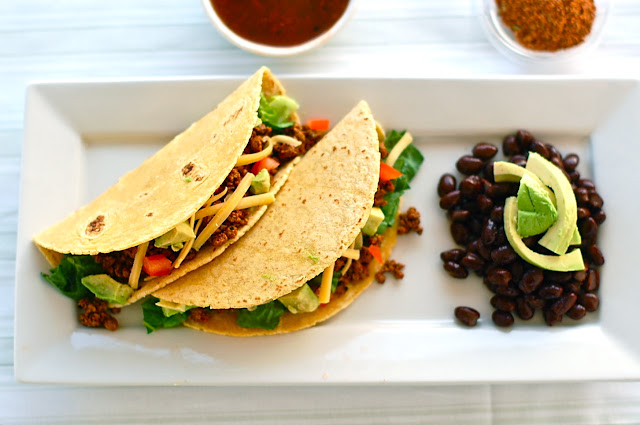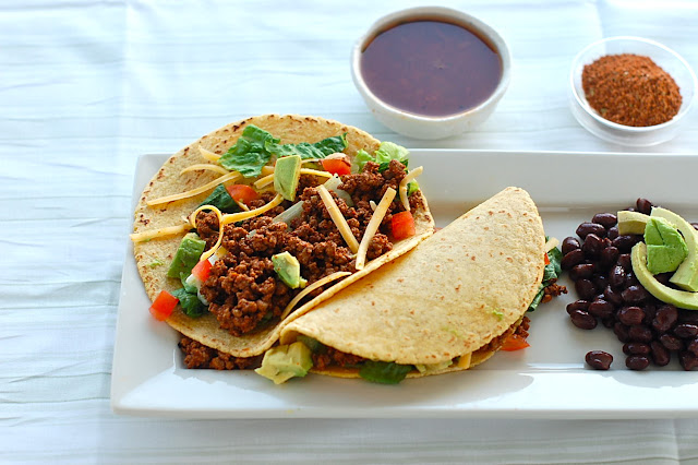 To make tacos, saute shallot or onion in a skillet for 3 minutes. Add ground beef and brown, cooking until there is no more pink left in the meat. Drain fat, add 2-3 tablespoons spice and 1/3 cup water. Stir together and simmer on low until slightly thickened. Add cilantro and stir through. If mixture seems a little dry for your taste, add a splash more water until the consistency is to your liking. Serve with taco fixin's of your choice.