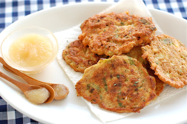 Heat a few tablespoons of vegetable oil in a frying pan over medium-high heat. Once the oil shimmers, drop batter by tablespoonfuls into pan. I recommend using a disher (I used a #20) to help with this. Flatten the pancakes a bit so they are not too thick to cook well in the middle. Fry approximately 3 minutes on each side, until browned on both sides and firm in the middle. Remove from frying pan onto paper towels to drain excess oil.