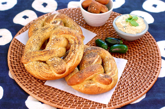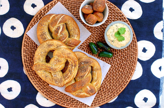 Either way, they were so good! I think cutting down the black pepper to just a light dusting would make them taste out of this world good. I found a few jalapeño cheese sauce recipes on the blogosphere, and the sauce itself was quite tasty, but the flavor of the peppers in combination with the amount of black pepper was not the best marriage of tastes. I would reserve the jalapeño sauce for a plain or simply salted pretzel, and stick with a white cheddar sauce for the black pepper pretzels to temper the bite just a smidgen.