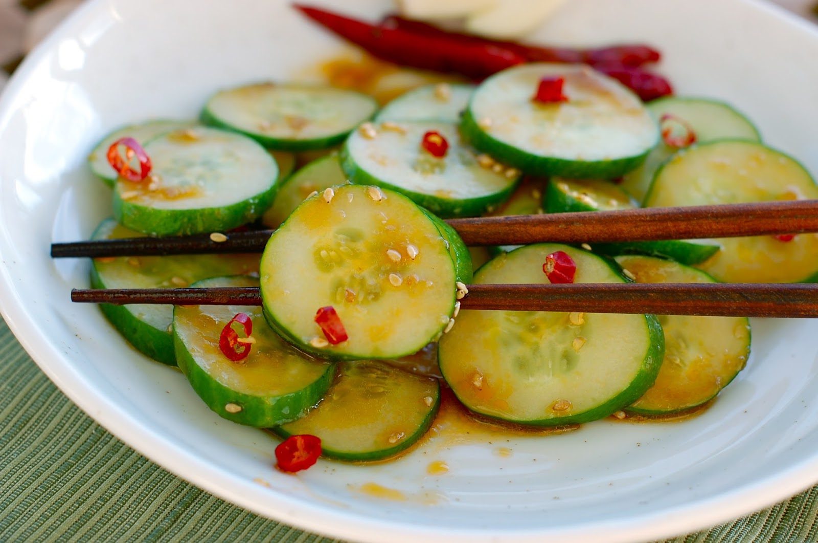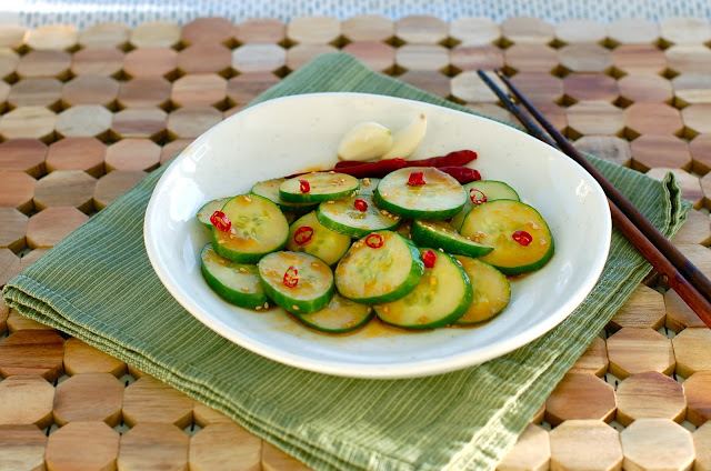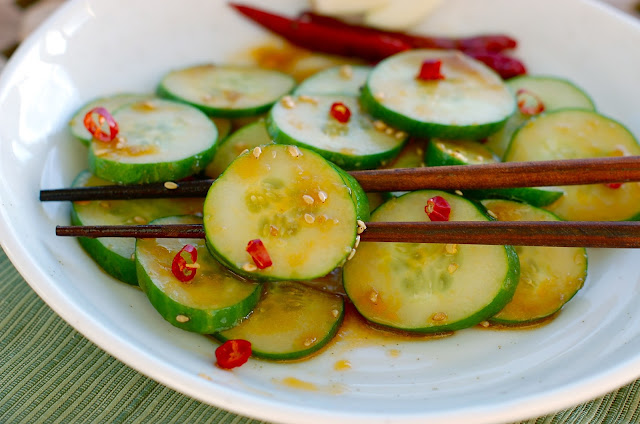Don't get me wrong, it's kind of a kick in the face of flavor with the pungent garlic and spicy hot chili peppers used as flavorings. But at the same time, it also has a cooling effect from the cucumber itself. It is kind of strange, but really really good. I fancied mine up a bit with some sesame seeds and a touch of soy sauce, but those are both completely optional if you don't want them. Try them out the next time you make sweet and sour pork or orange beef-- you won't be disappointed!