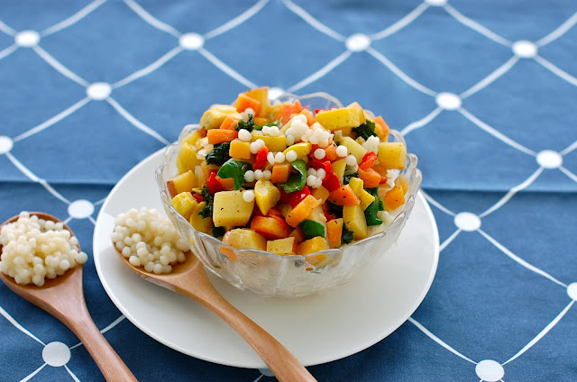 The pearl couscous, also known as Israeli couscous, was more of an experiment for me. I have used the smaller, more cornmeal looking couscous for years, but for whatever reason had never quite ventured into the realm of the pearl variety. It has a more distinct pasta taste than its smaller cousin, but cooks almost as quickly and worked amazingly in salads such as this one. I would recommend lightly toasting the pasta in a dry skillet before cooking per the manufacturer's instructions, since that helps bring out their flavor a bit more in the final dish.